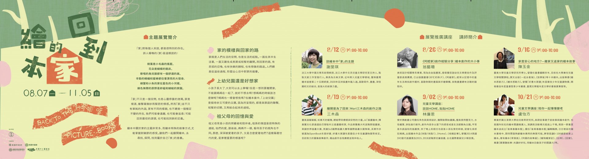 | 一、 | 為推廣桃園兒童文學,桃園市兒童文學館於8月7日至11月5日舉辦《回到繪本的「家」》展覽,由淡江大學中文系副教授謝旻琪擔任策展人,規劃以「家」為核心概念,邀請民眾從不同角度尋找「家」的意義。不僅展覽現場有繪本互動展,更延伸舉辦共6場次的兒童文學講座與4場次的研習活動,歡迎踴躍參加。 |