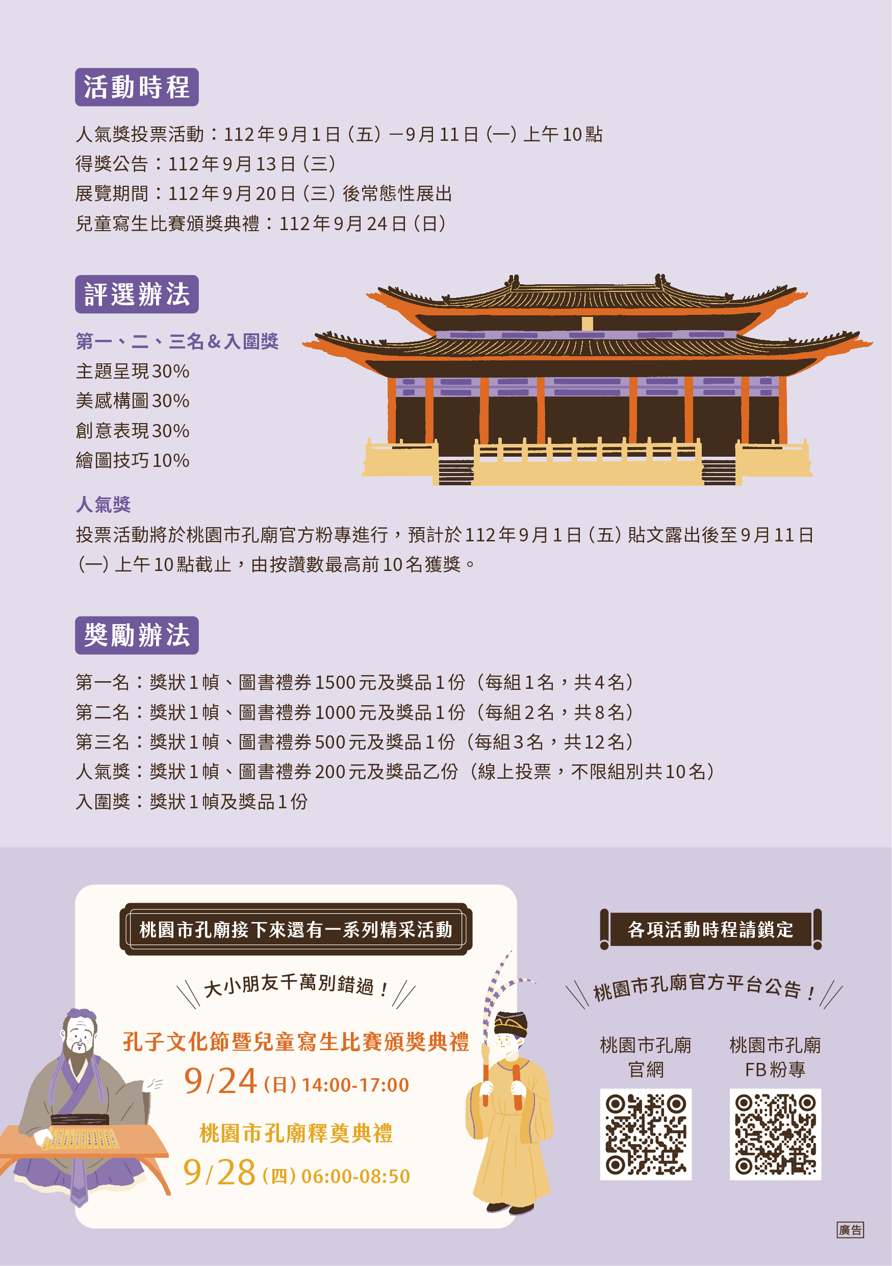 | 三、 | 檢附112年桃園市孔廟兒童寫生比賽活動宣傳電子檔,活動訊息請洽本所粉絲專業最新活動消息頁面:https://www.facebook.com/tycg.confuciustemple1/。 |